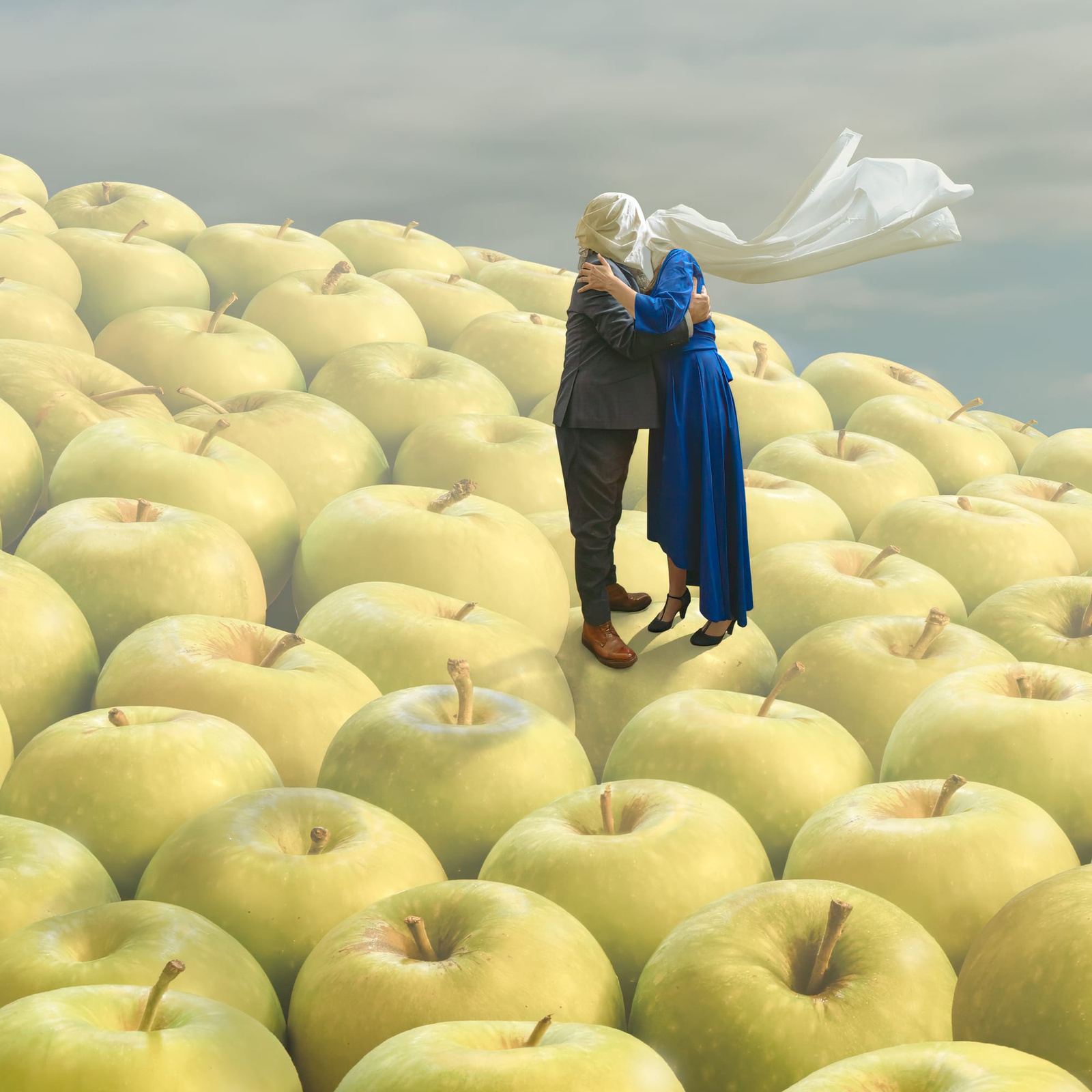 Magritte’s visual language continues to inspire artists across disciplines—including my own work, The Sun of Man. This piece unfolds as a surreal landscape of apples stretching into the horizon, an impossible orchard that nods directly to Magritte’s fascination with repetition and scale. On a distant rise, a couple embrace with their heads veiled in cloth, echoing The Lovers while emphasising both intimacy and isolation.