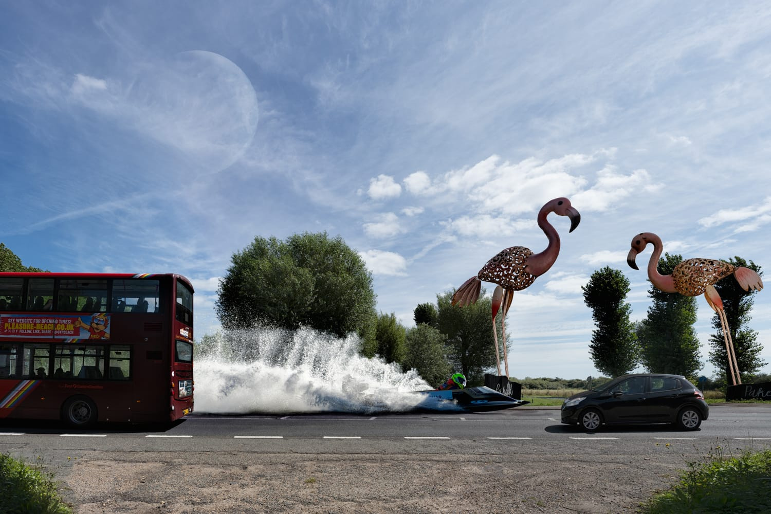 - Escape From the Seaside — a speedboat tearing along a road, absurd yet strangely familiar.