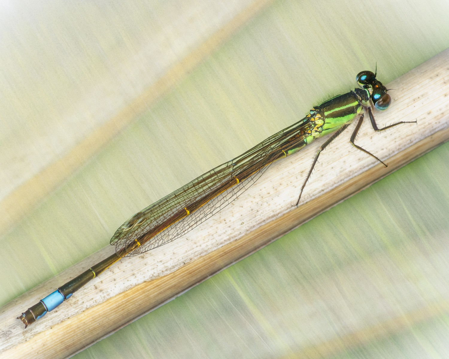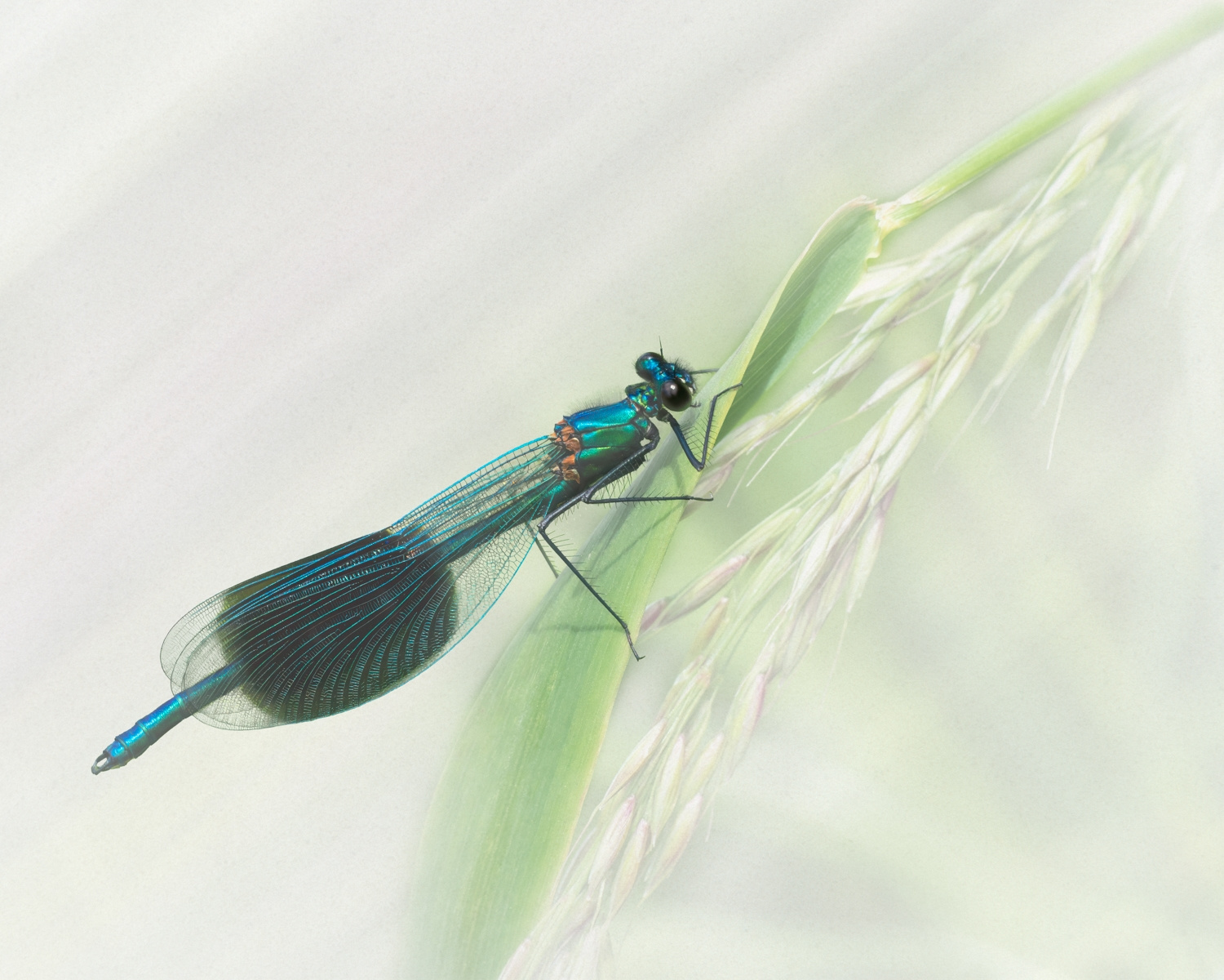 Cool emeralds, teals, leaf‑greens, and icy blues dominate. Warmth appears in accents: the scarlet and gold of the large red damselfly, or the amber glow of the female ruddy darter. Light is soft and natural, emphasising contour and texture over harsh contrast.