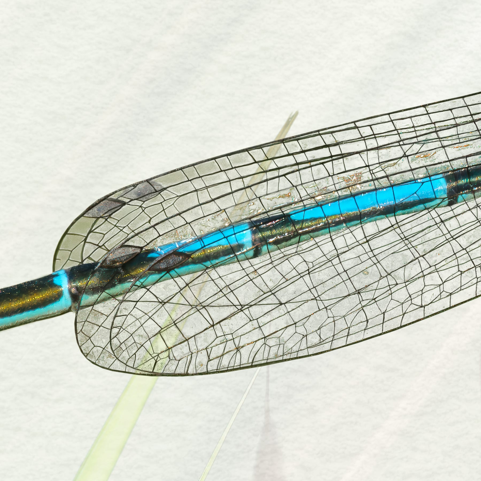 This piece draws viewers into a vivid portrait of the male azure damselfly, its body streaked in electric blues and deep blacks that contrast beautifully with the pale green blade of grass. The wings shimmer delicately, etched with transparent veins that catch the light like spun glass. The close perspective lends a sense of intimacy, allowing every segmented curve and colour shift to stand out. The background fades softly into light tones, enhancing the damselfly’s presence without distraction. The entire piece feels energetic but restrained, precise natural beauty presented with clean modernity.