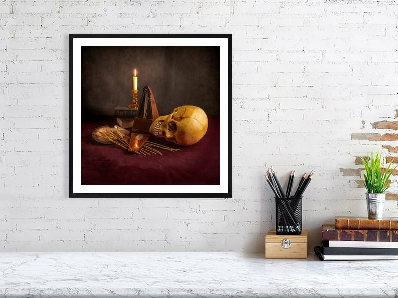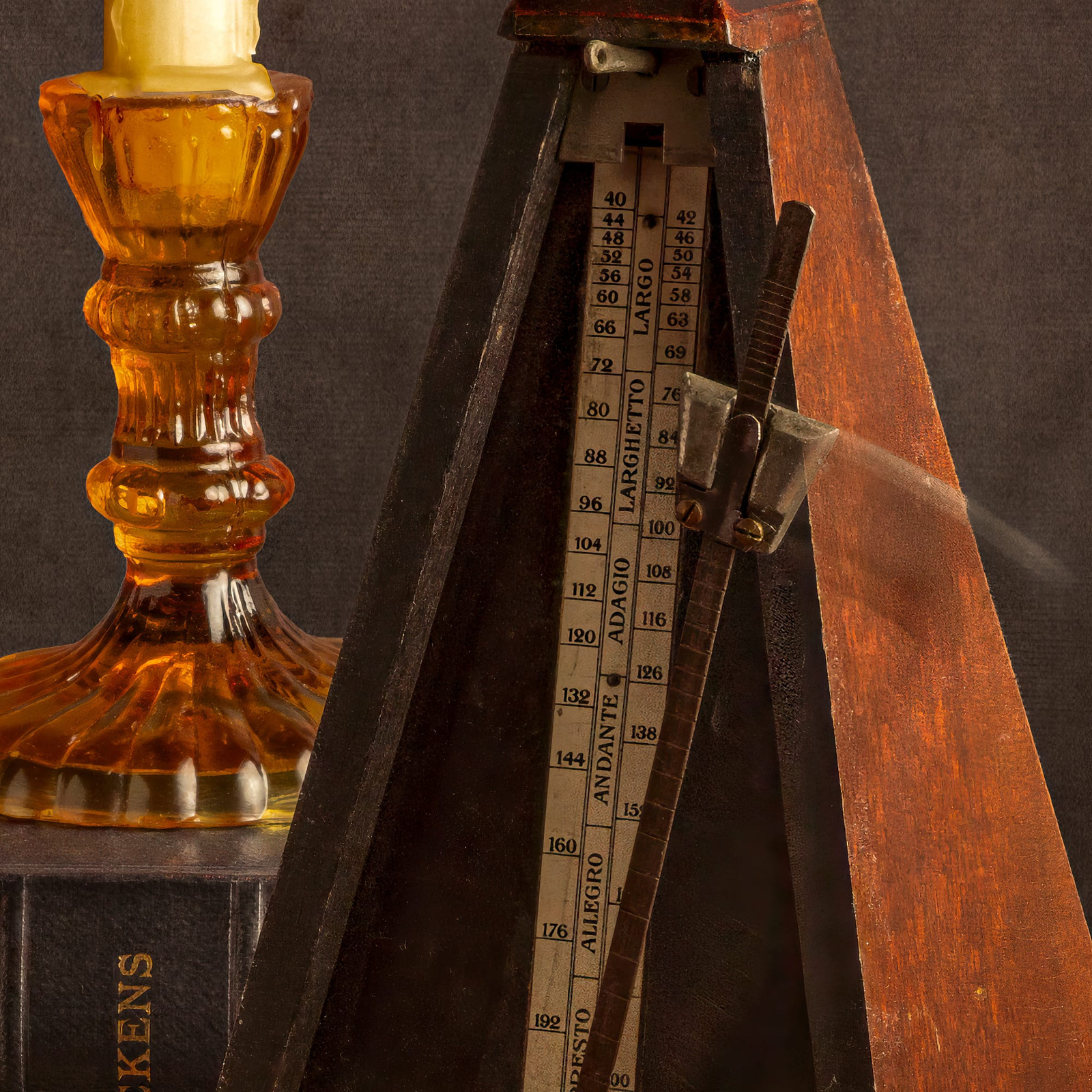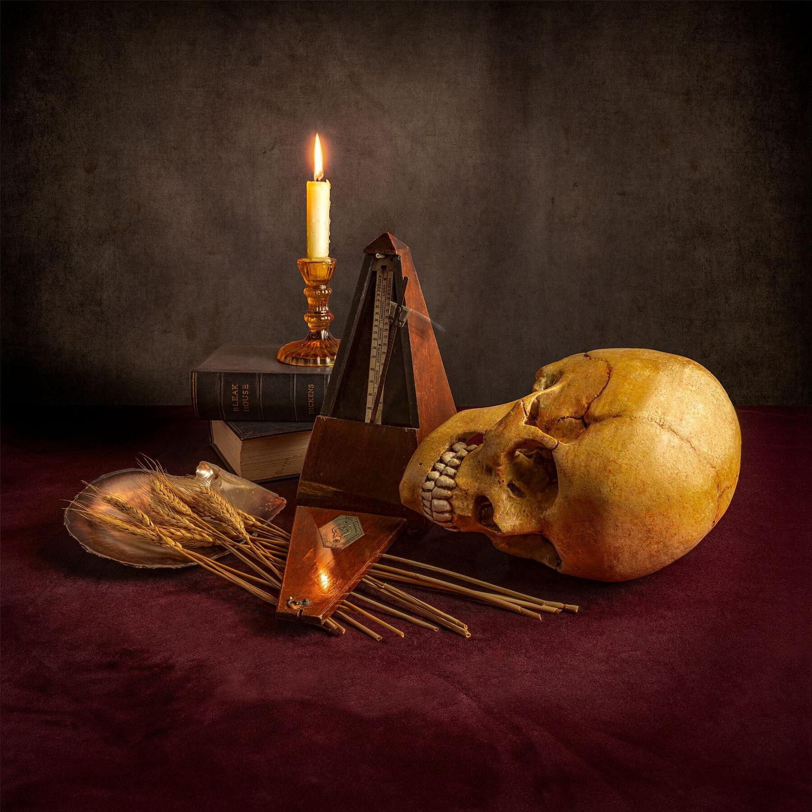 This still life weaves together symbols of mortality, knowledge, time, and renewal with quiet precision. The skull, lying on its side, anchors the composition as a stark reminder of impermanence, while the lit candle speaks of both illumination and the fragile brevity of existence. The presence of Bleak House introduces a literary echo of human struggle and endurance, grounding the piece in cultural memory. The metronome, caught mid-swing, embodies the relentless passage of time, its cover resting across the wheat as though to suggest the tension between order and nature’s cycles. The oyster shell, cradling the wheat ears, becomes a vessel of fertility and sustenance, a counterpoint to the skull that reminds us of life’s capacity to renew itself. Together, these elements form a meditation on the fragile but enduring rhythms that bind existence.